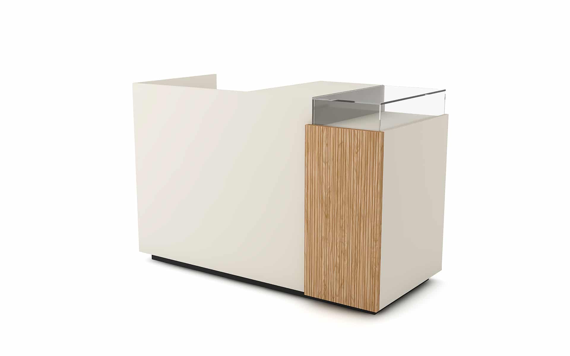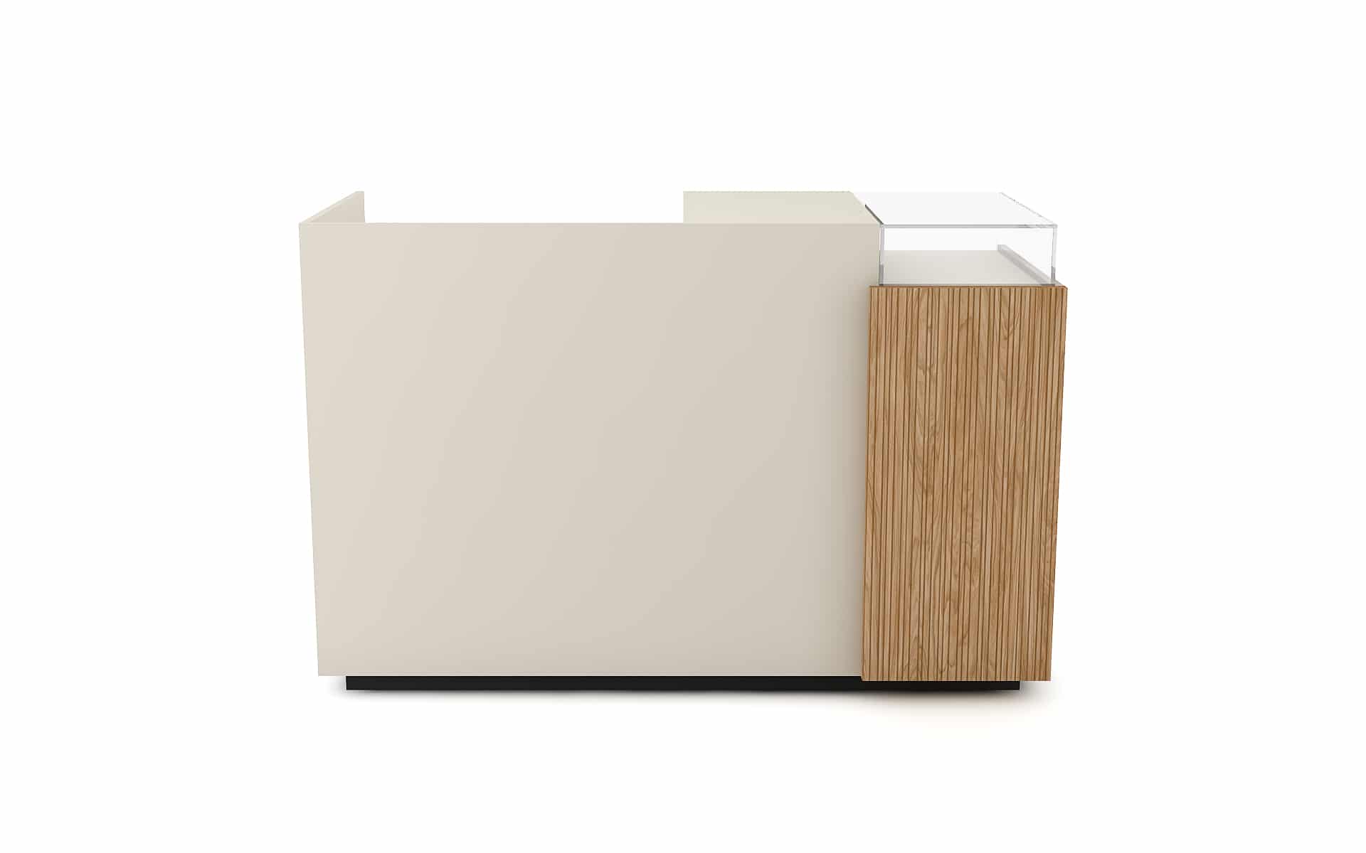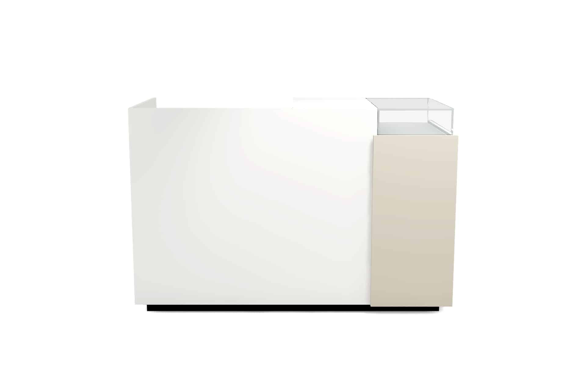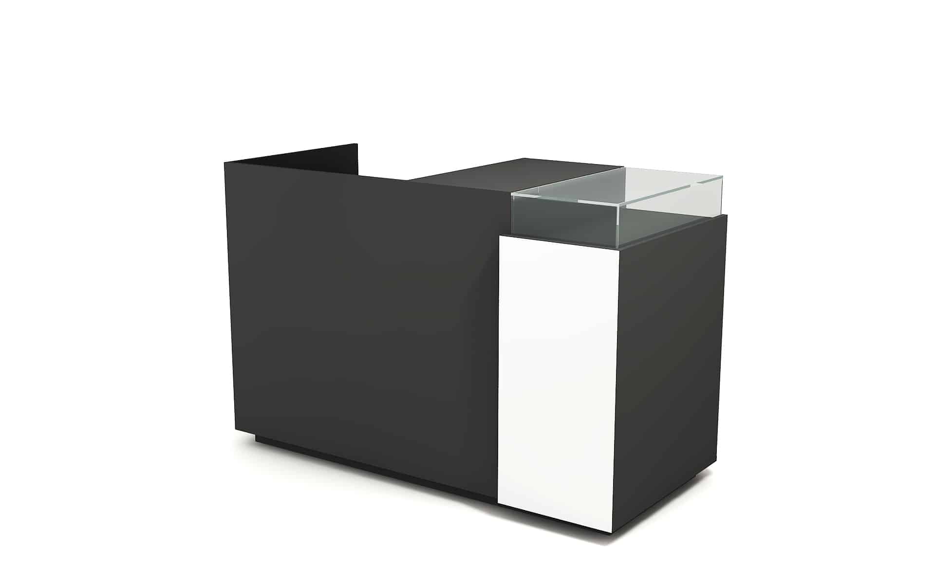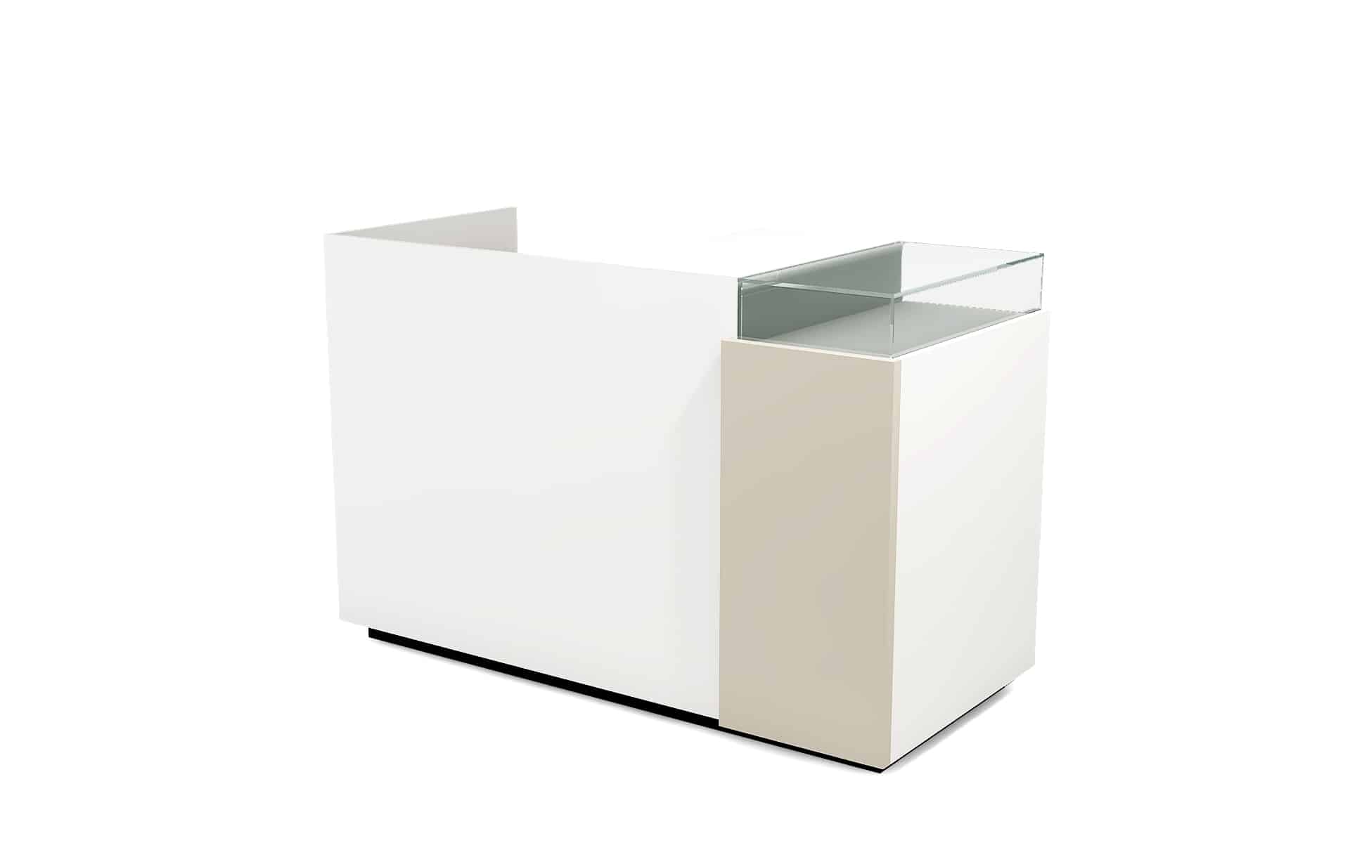 Comptoir de caisse avec insert frontal et vitrine d’exposition