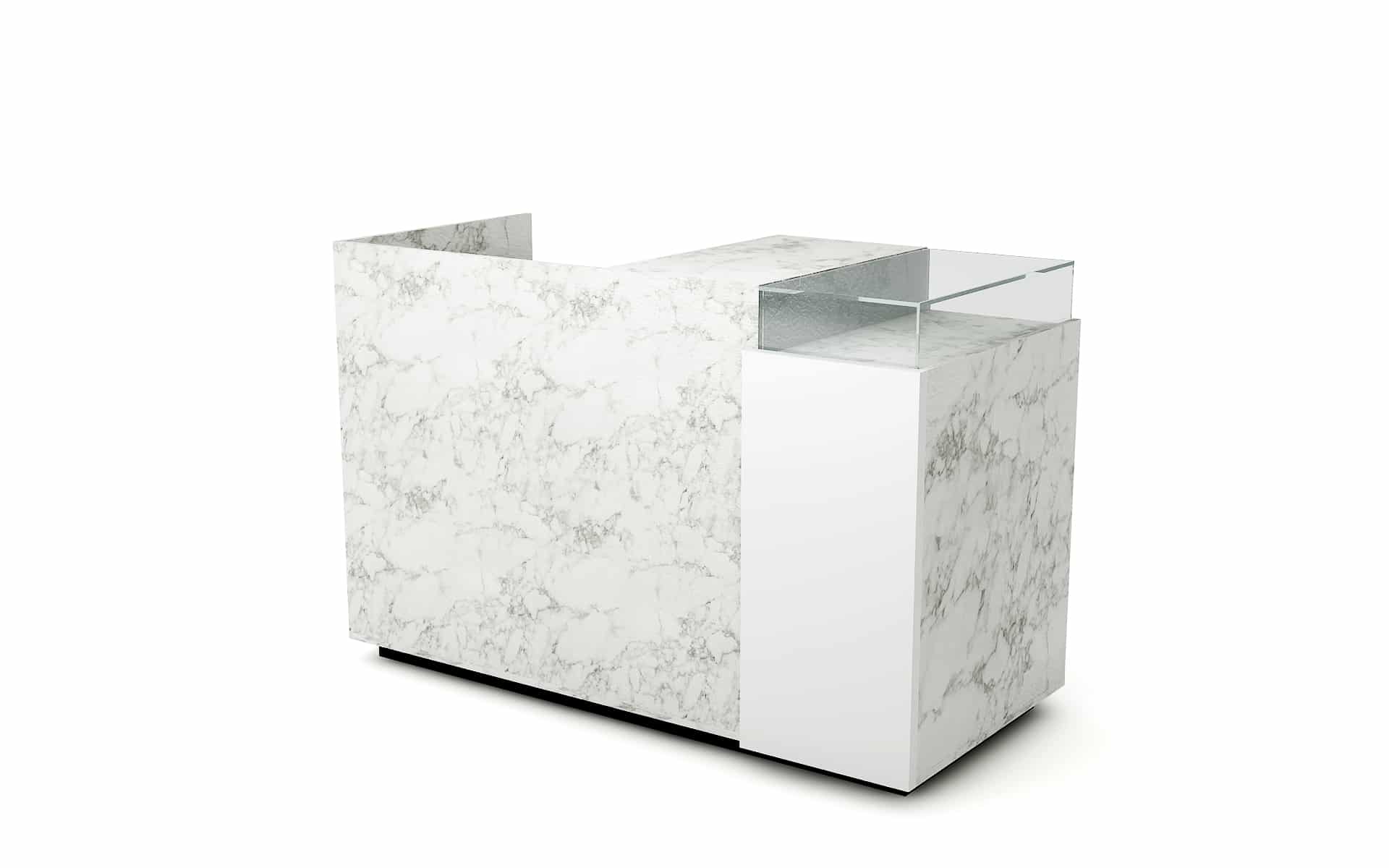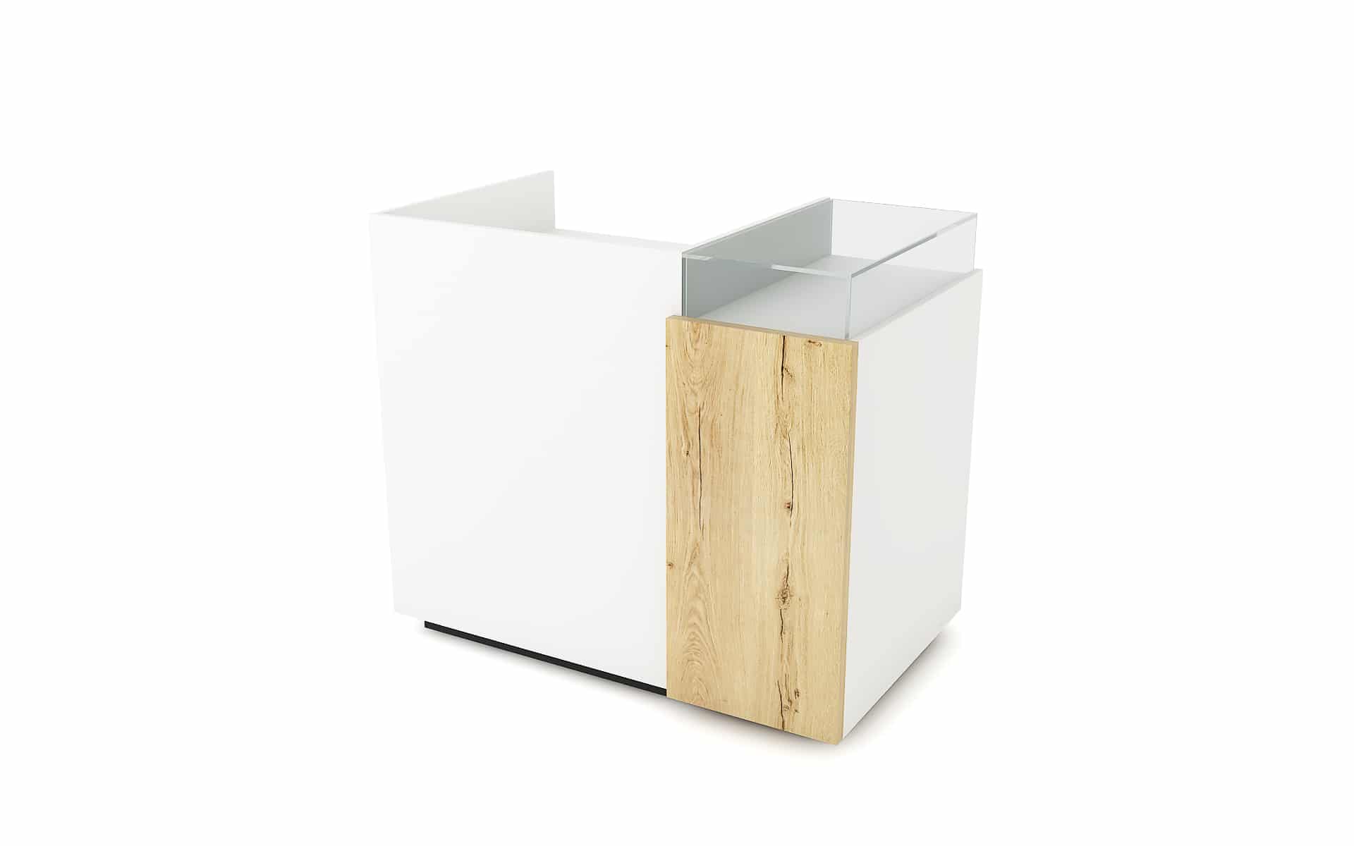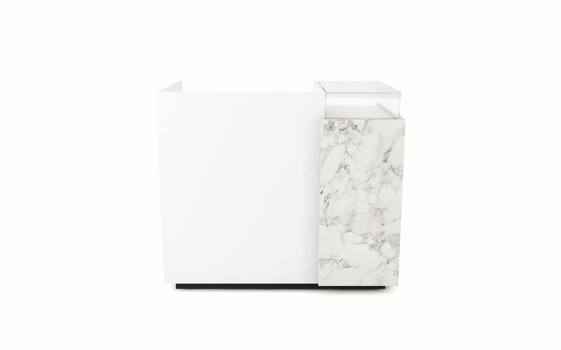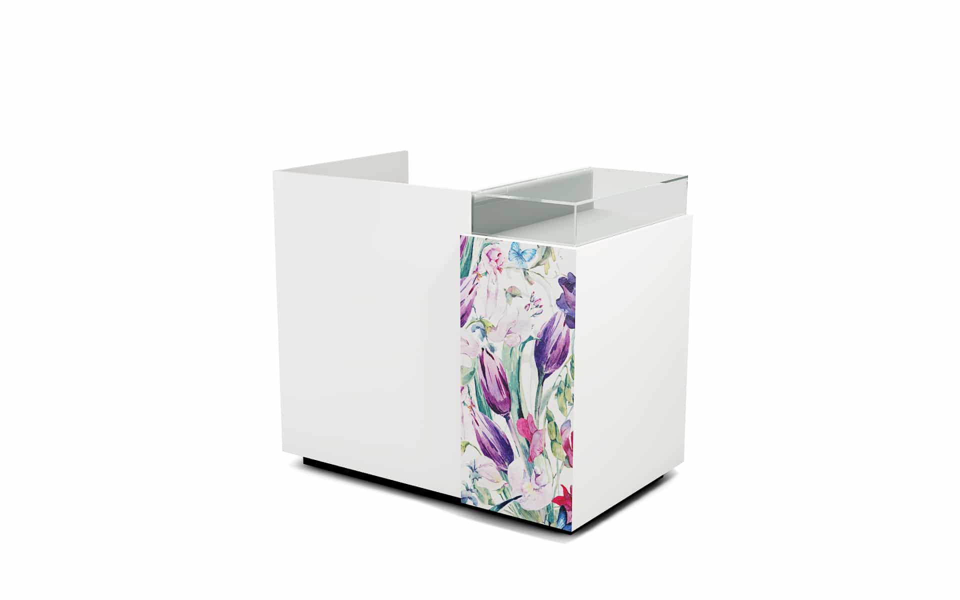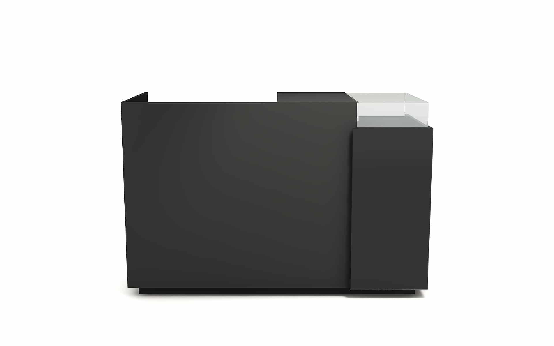Comptoir de caisse avec insert frontal et vitrine d’exposition