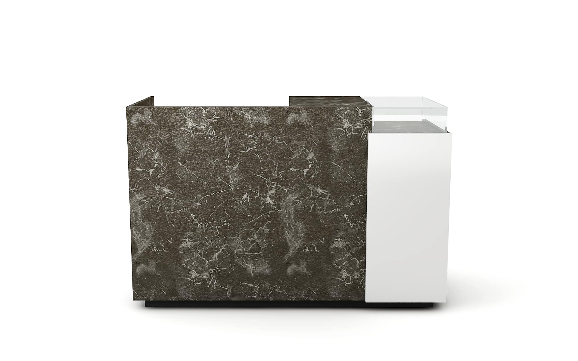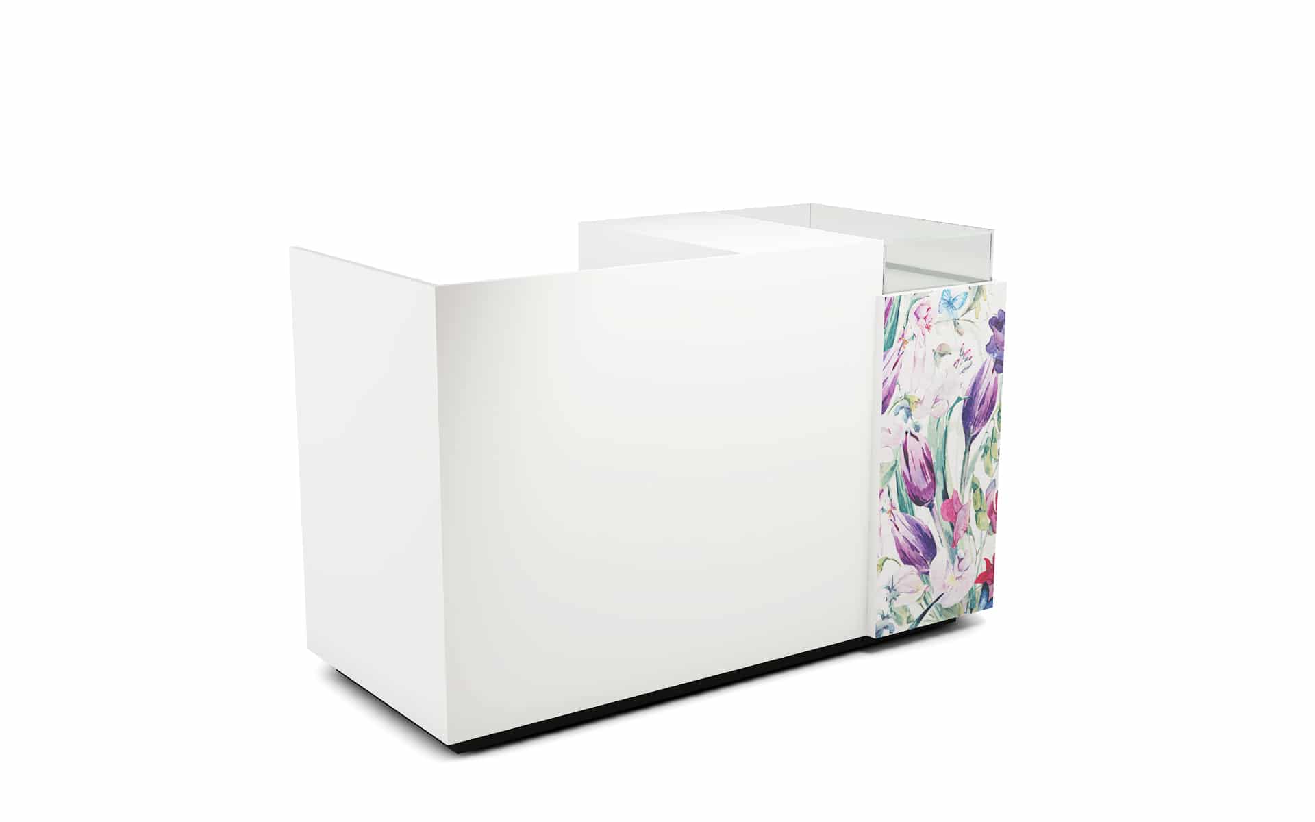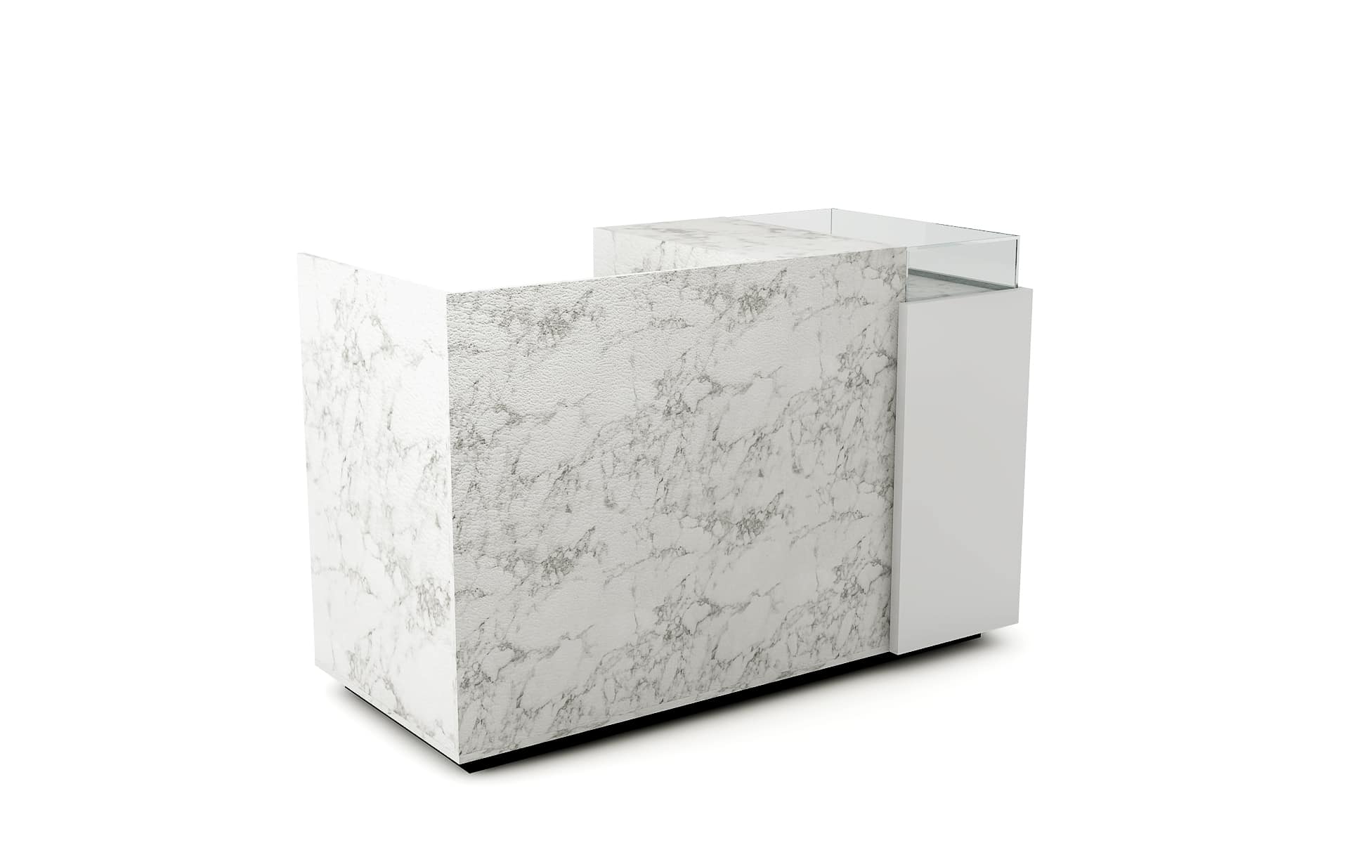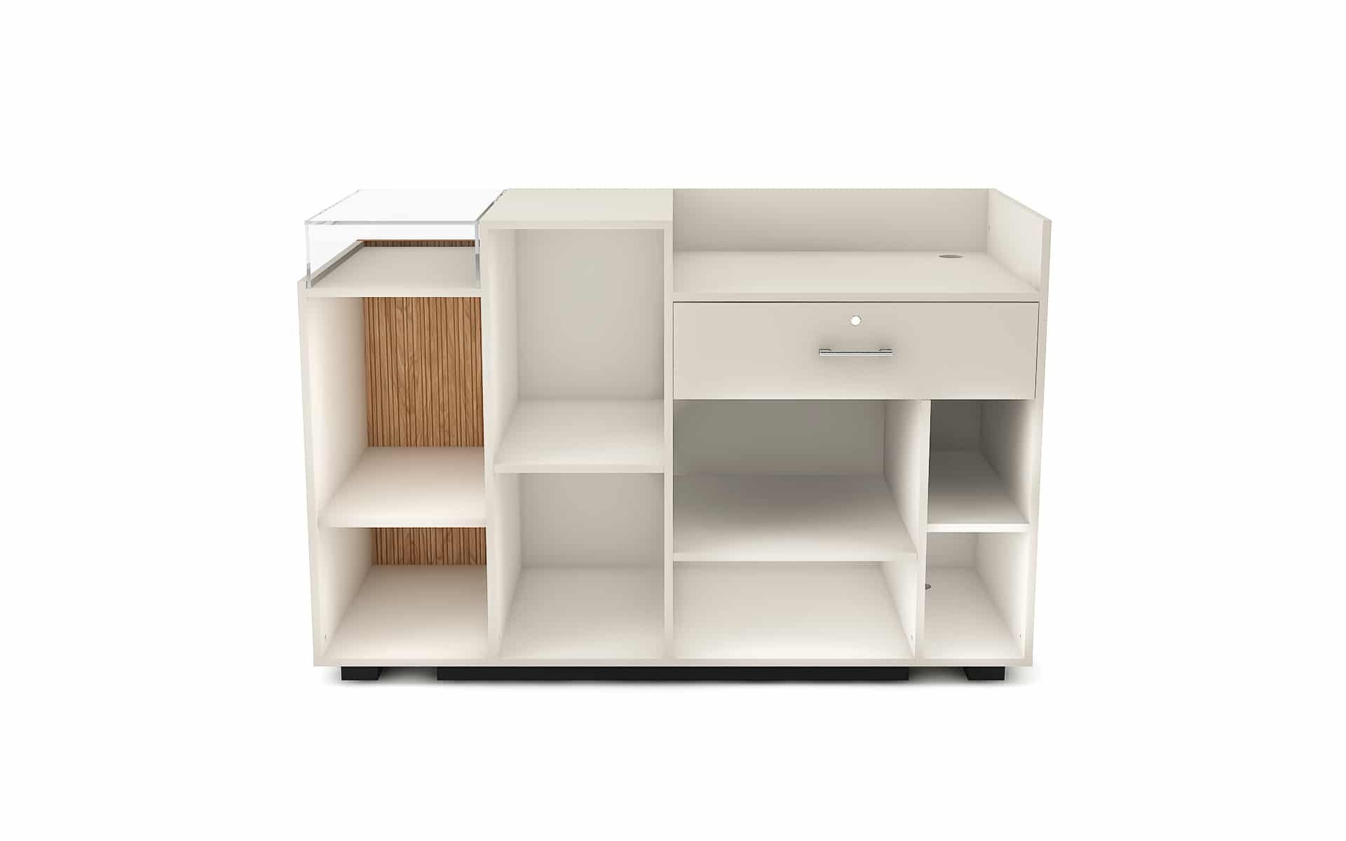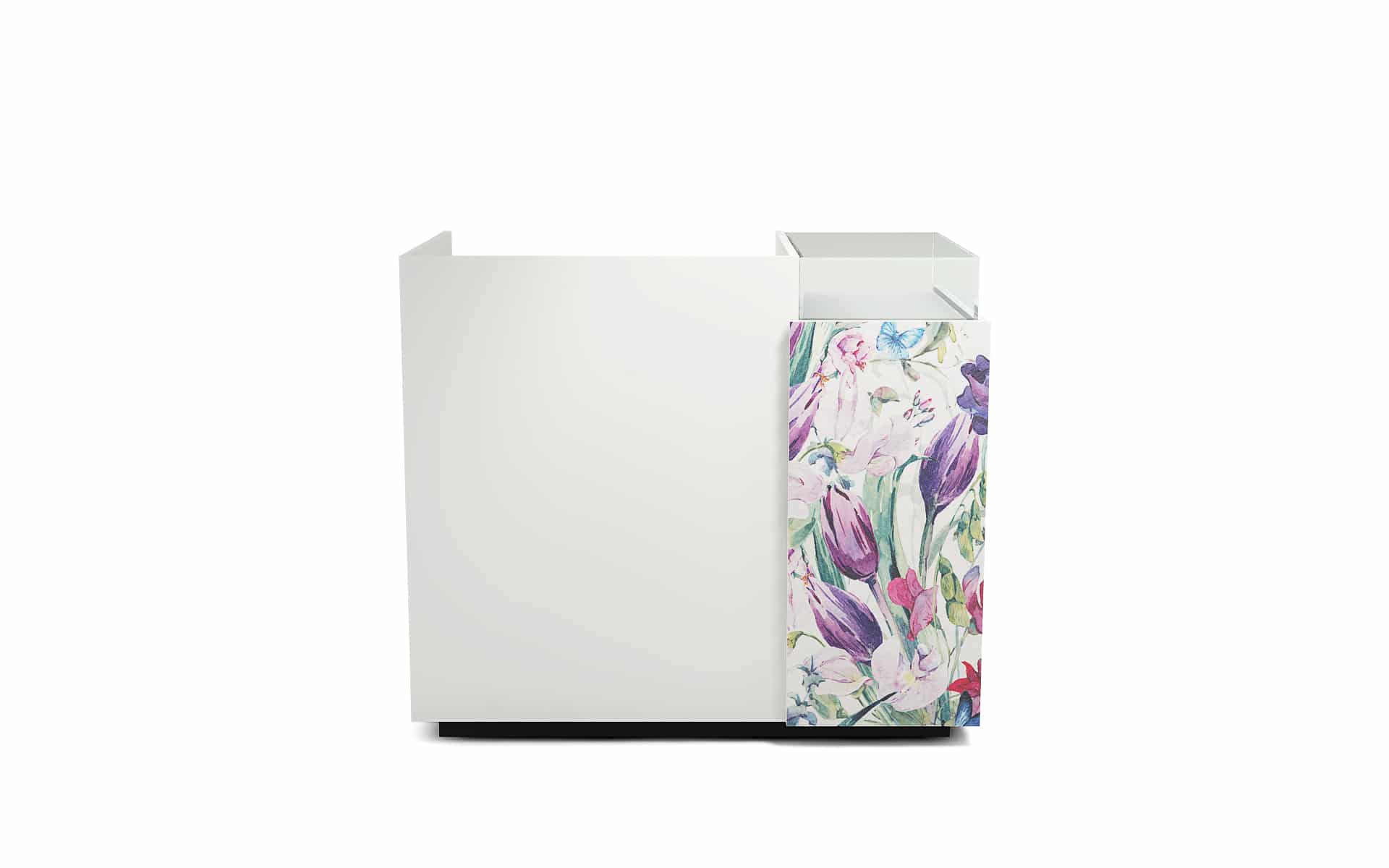 Comptoir de caisse avec insert frontal et vitrine d’exposition