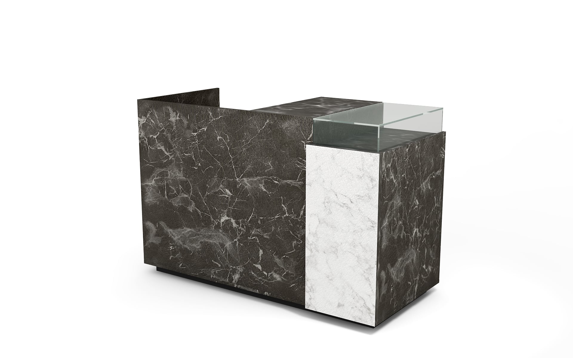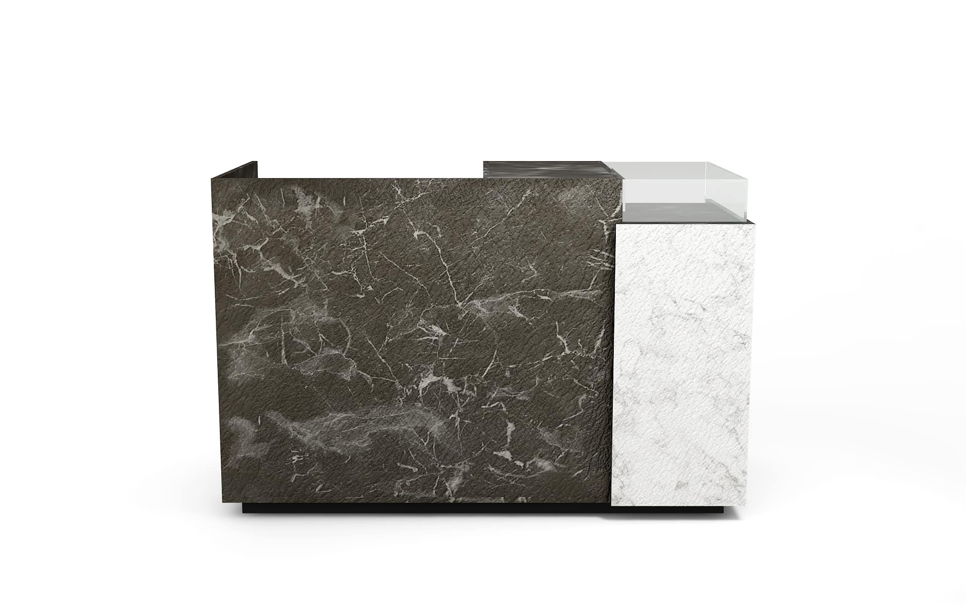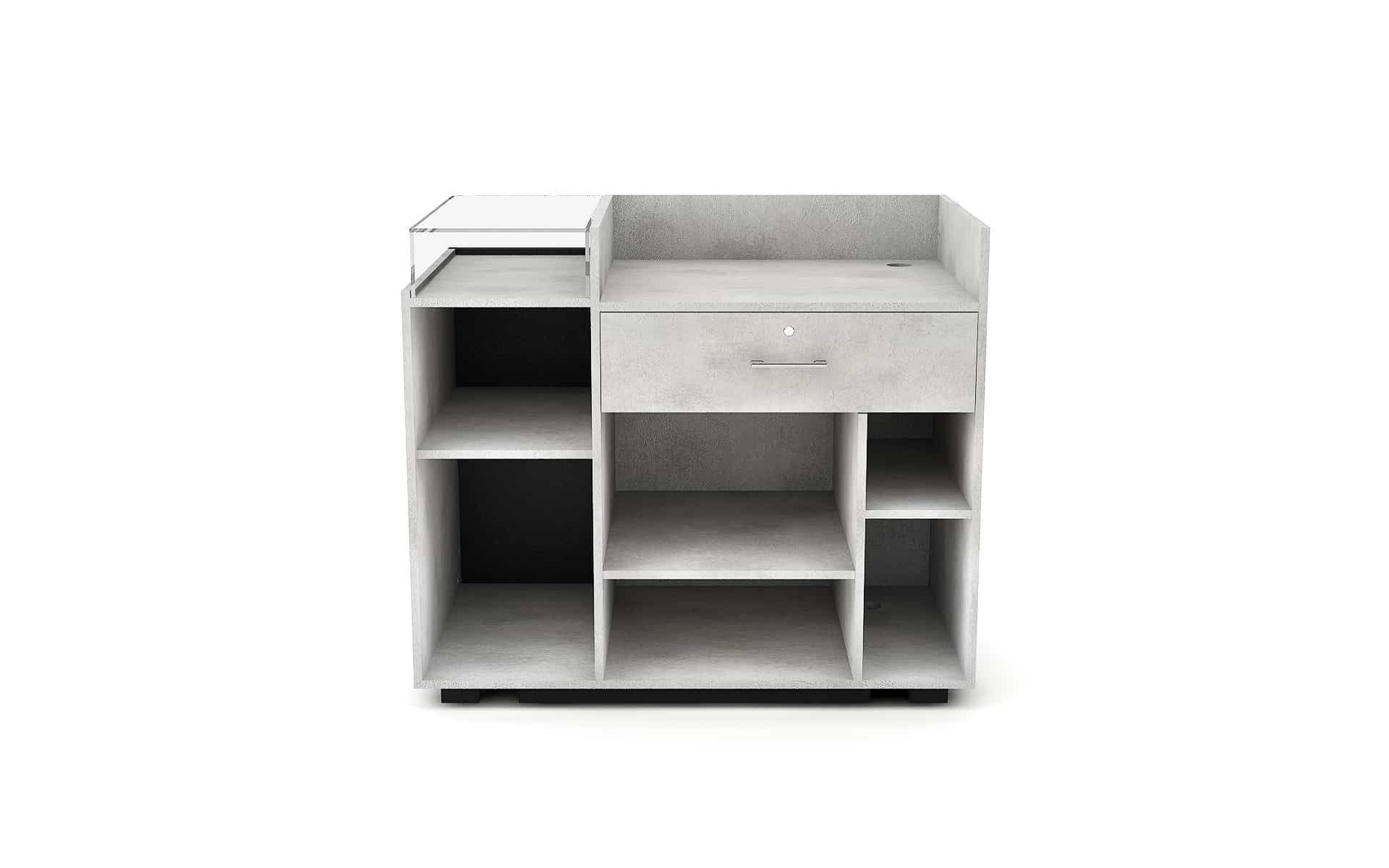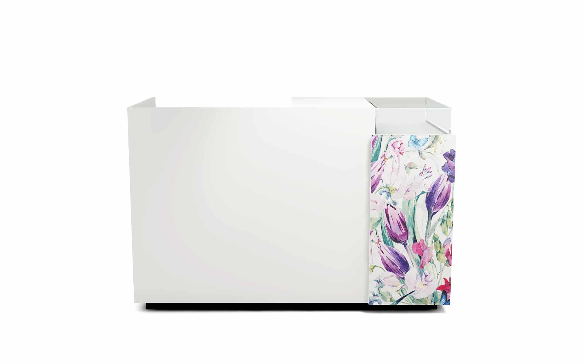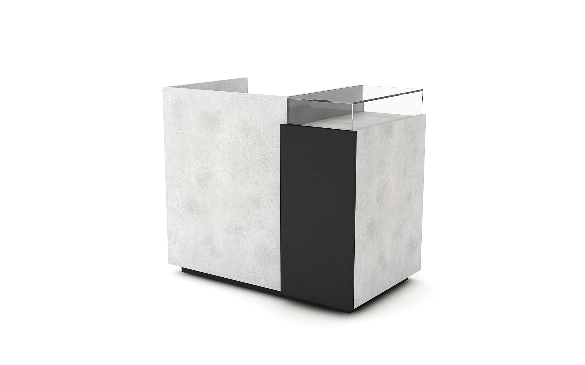 Comptoir de caisse avec insert frontal et vitrine d’exposition